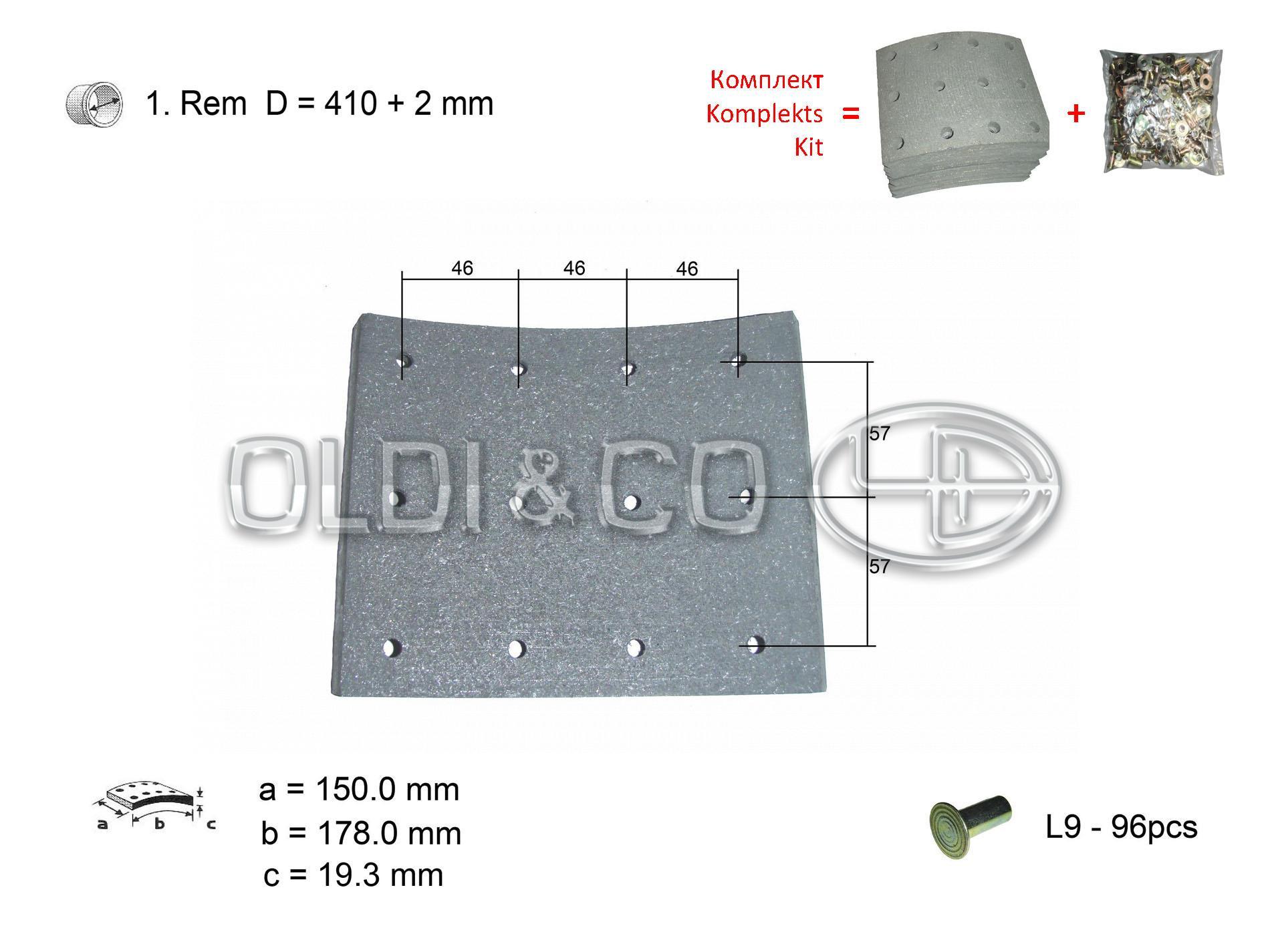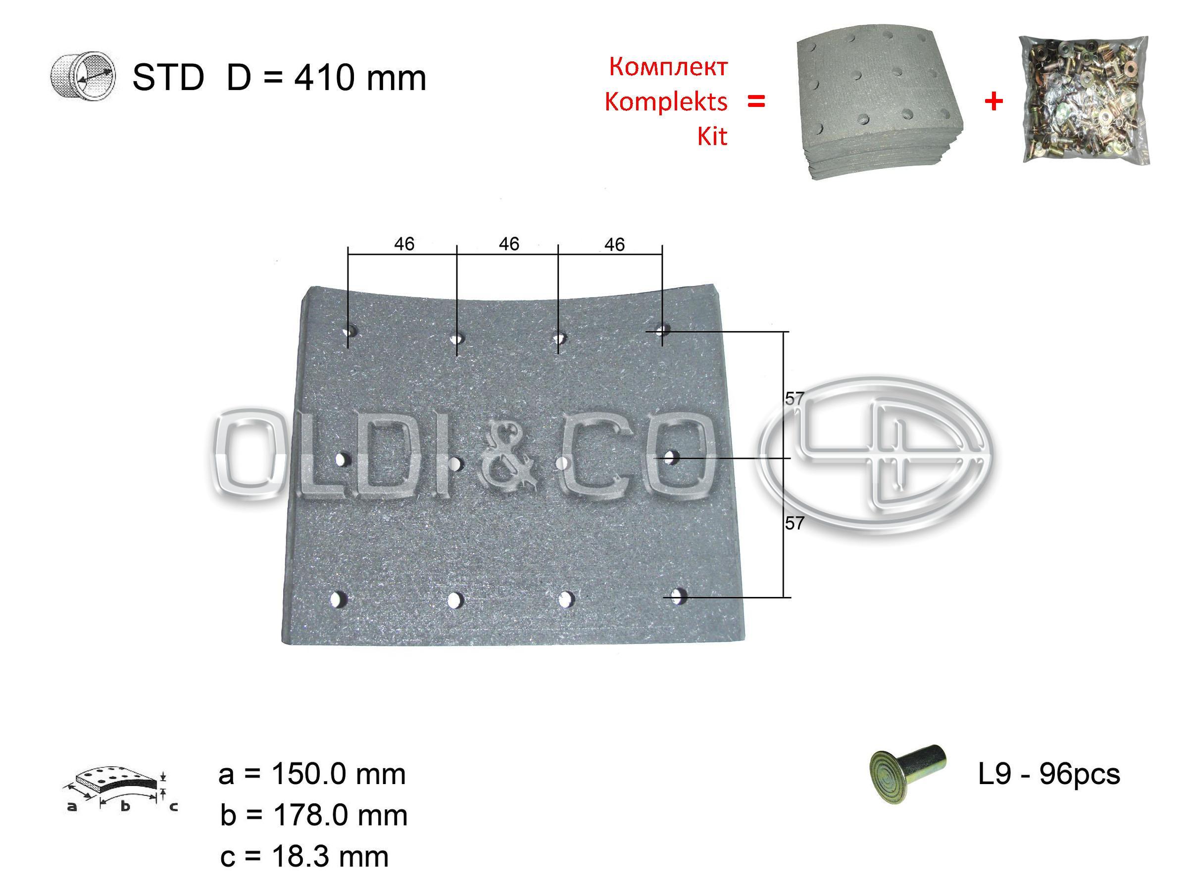VOLVO - F10, F12, F16, FL7'85, FL10'85, FL12'85 Linings, WVA number: 19941 Repair size, mm: STD Rivet type: L9 Diameter of a drum, mm: 410 Length, mm: 178 Quantity of rivets, pcs.: 96 Thickness, mm: 18.3 Width of a block, mm: 150