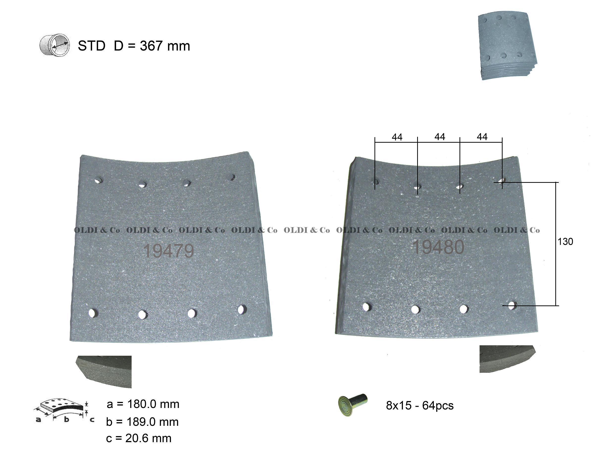 SAF Linings, WVA number: 19480 Repair size, mm: STD Rivet type: 8x15 Diameter of a drum, mm: 367 Length, mm: 189 Quantity of rivets, pcs.: 64 Thickness, mm: 20.6 Width of a block, mm: 180