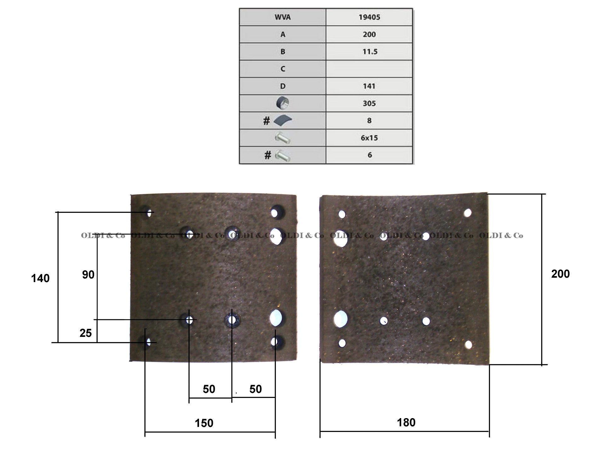 _TRAILERS Linings, WVA number: 19405 Repair size, mm: STD Rivet type: 6x15 Diameter of a drum, mm: 305 Length, mm: 141 Quantity of rivets, pcs.: 80 Thickness, mm: 11.5 Width of a block, mm: 200