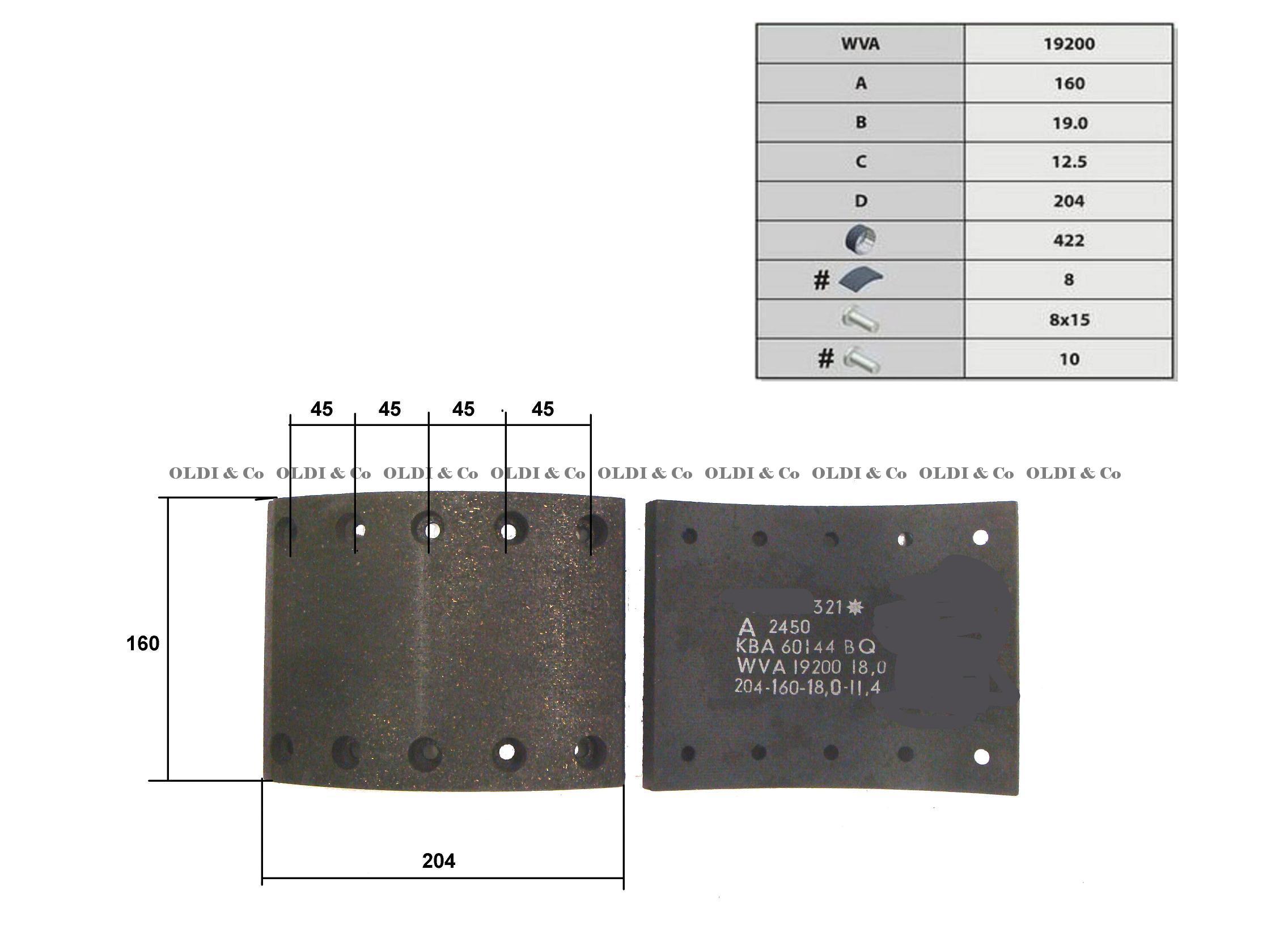 BPW Linings, WVA number: 19200 Repair size, mm: STD Rivet type: 8x15 Diameter of a drum, mm: 420 Length, mm: 204 Quantity of rivets, pcs.: 80 Thickness, mm: 17.8 Width of a block, mm: 160