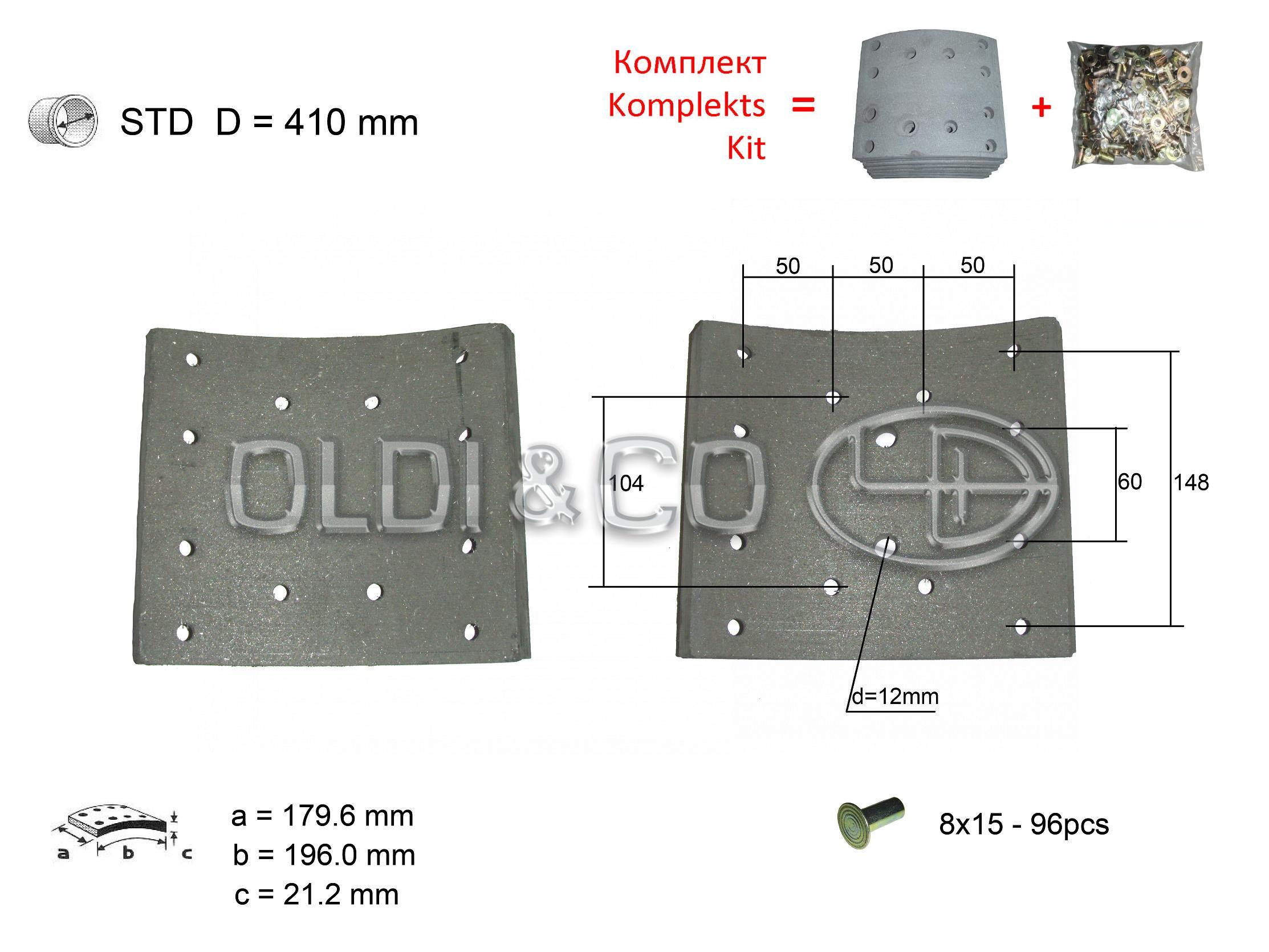 IVECO - Series EURO Linings, WVA number: 19555 Repair size, mm: STD Rivet type: 8x15 Diameter of a drum, mm: 410 Length, mm: 196 Quantity of rivets, pcs.: 96 Thickness, mm: 21.2 Width of a block, mm: 179.6