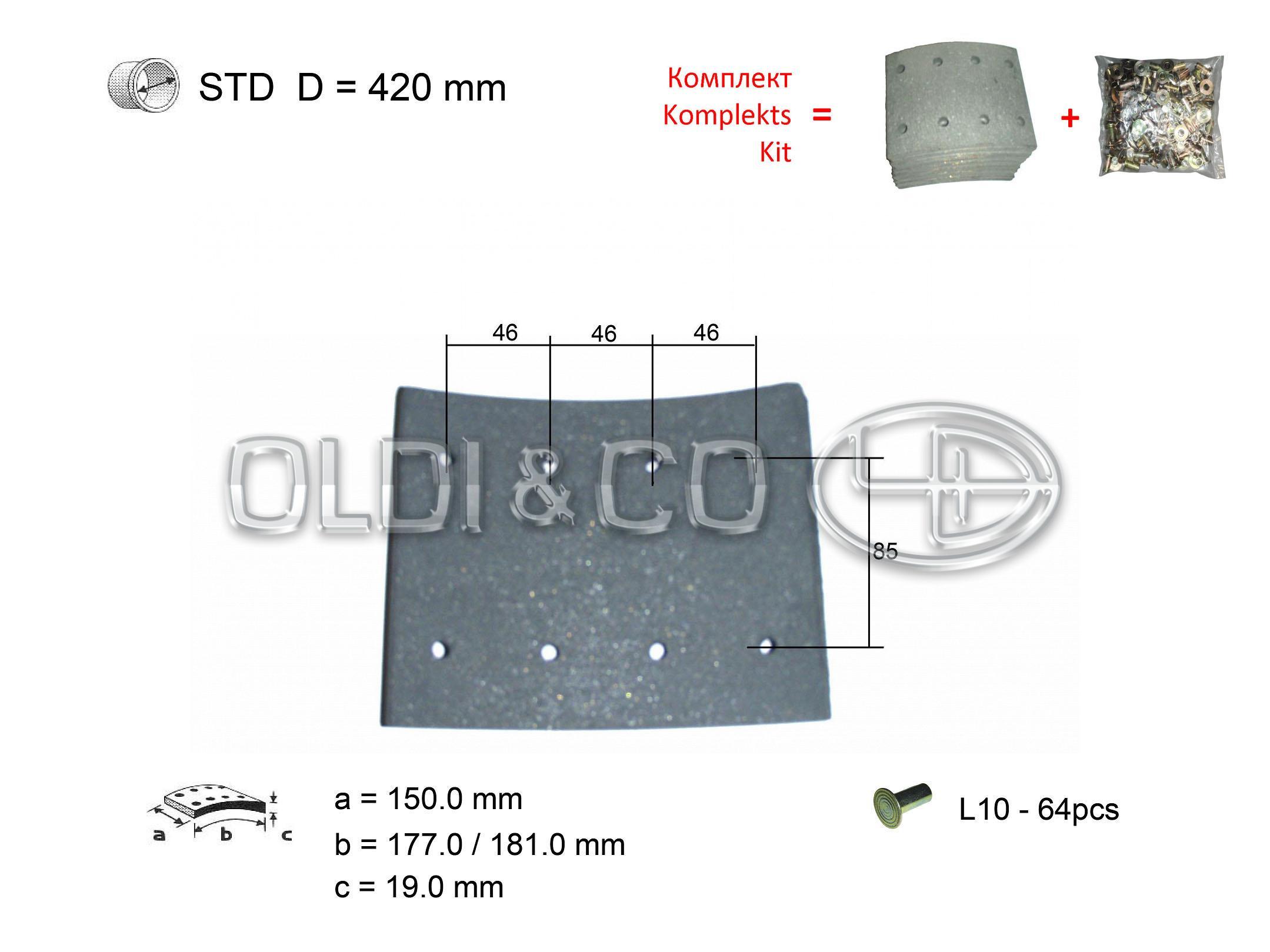 DAF - F2100, F2300, F2500, F2600, F2700, F2800, F2900, F3200, F3300, F3600 Linings, WVA number: 19901 Repair size, mm: STD Rivet type: L10 Diameter of a drum, mm: 420 Length, mm: 177/181 Quantity of rivets, pcs.: 64 Thickness, mm: 19.0 Width of a block, mm: 150