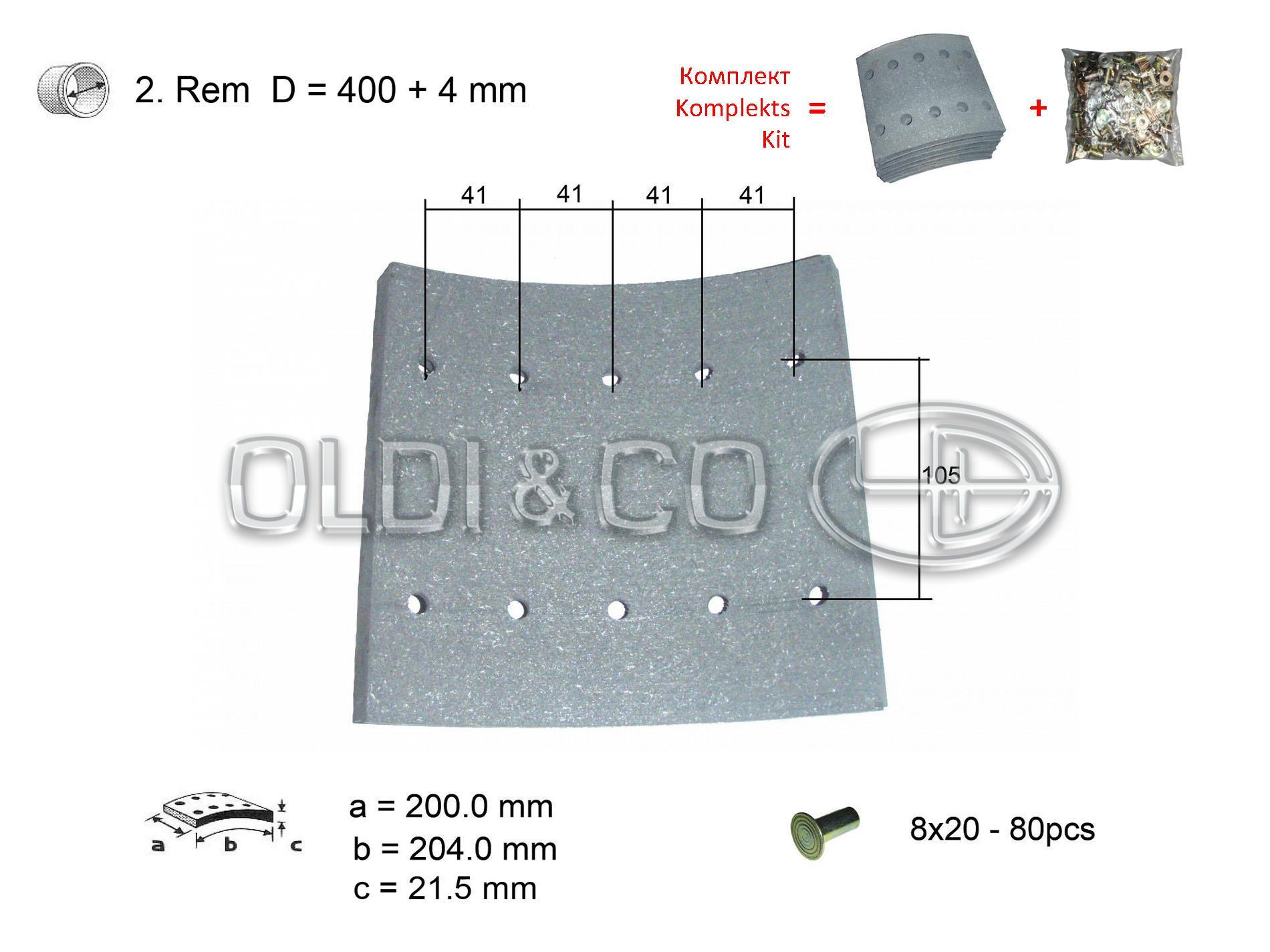 KASSBOHRER Linings, WVA number: 19166 Linings, WVA number: 19167 Repair size, mm: 2 rem Rivet type: 8x20 Diameter of a drum, mm: 400 Length, mm: 204 Quantity of rivets, pcs.: 80 Thickness, mm: 21.5/21.4 Width of a block, mm: 200