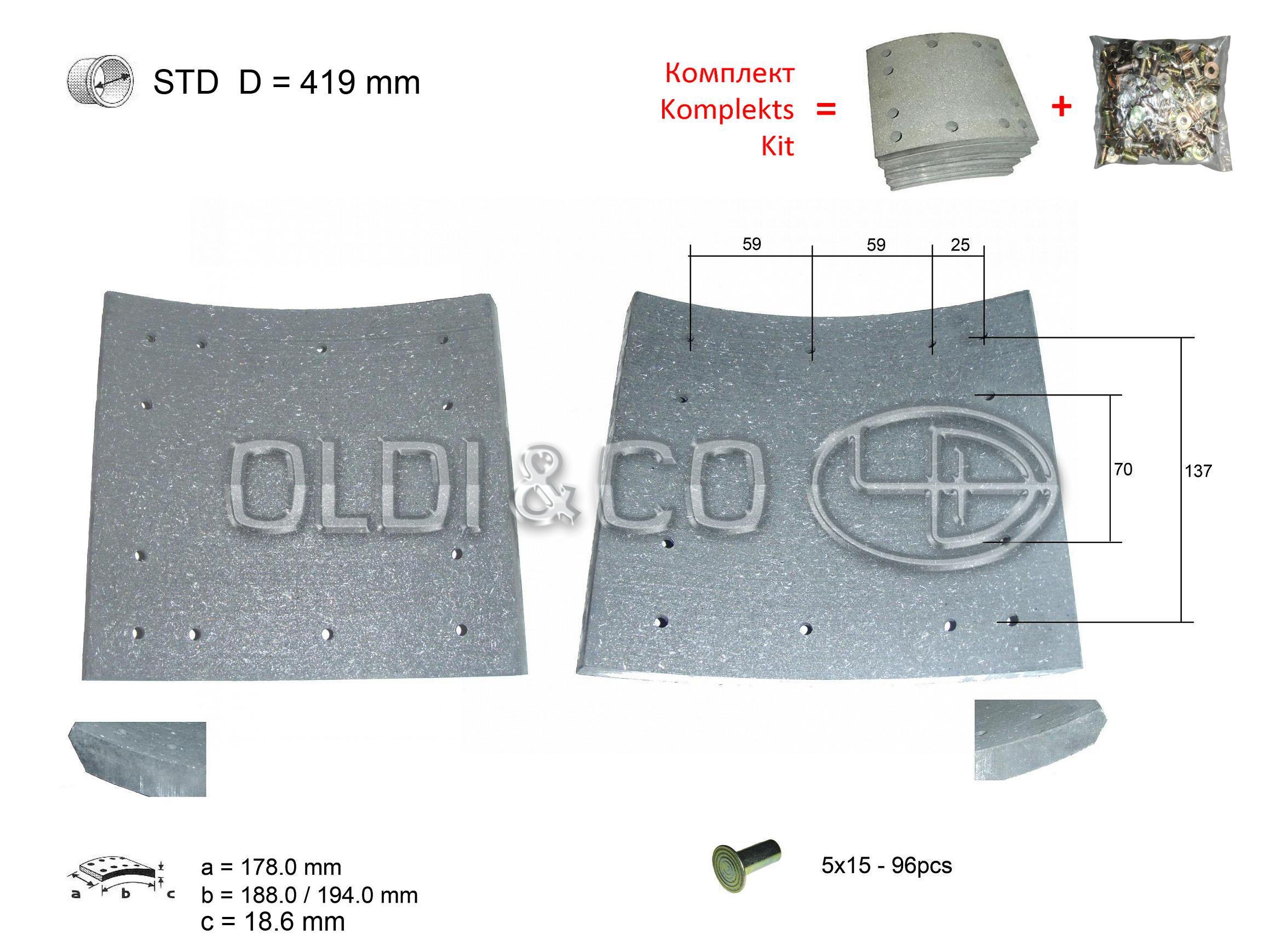 | Накладки, номер WVA: 19036 Накладки, номер WVA: 19037 Ремонтный размер, мм: STD Тип заклепки: 5x15 Диаметр барабана, мм: 419 Длина, мм: 194 Длина, мм: 188 Количество заклёпок, шт: 96 Толщина, мм: 18.6/18.2 Ширина колодки, мм: 178 | ||||||||||||||||