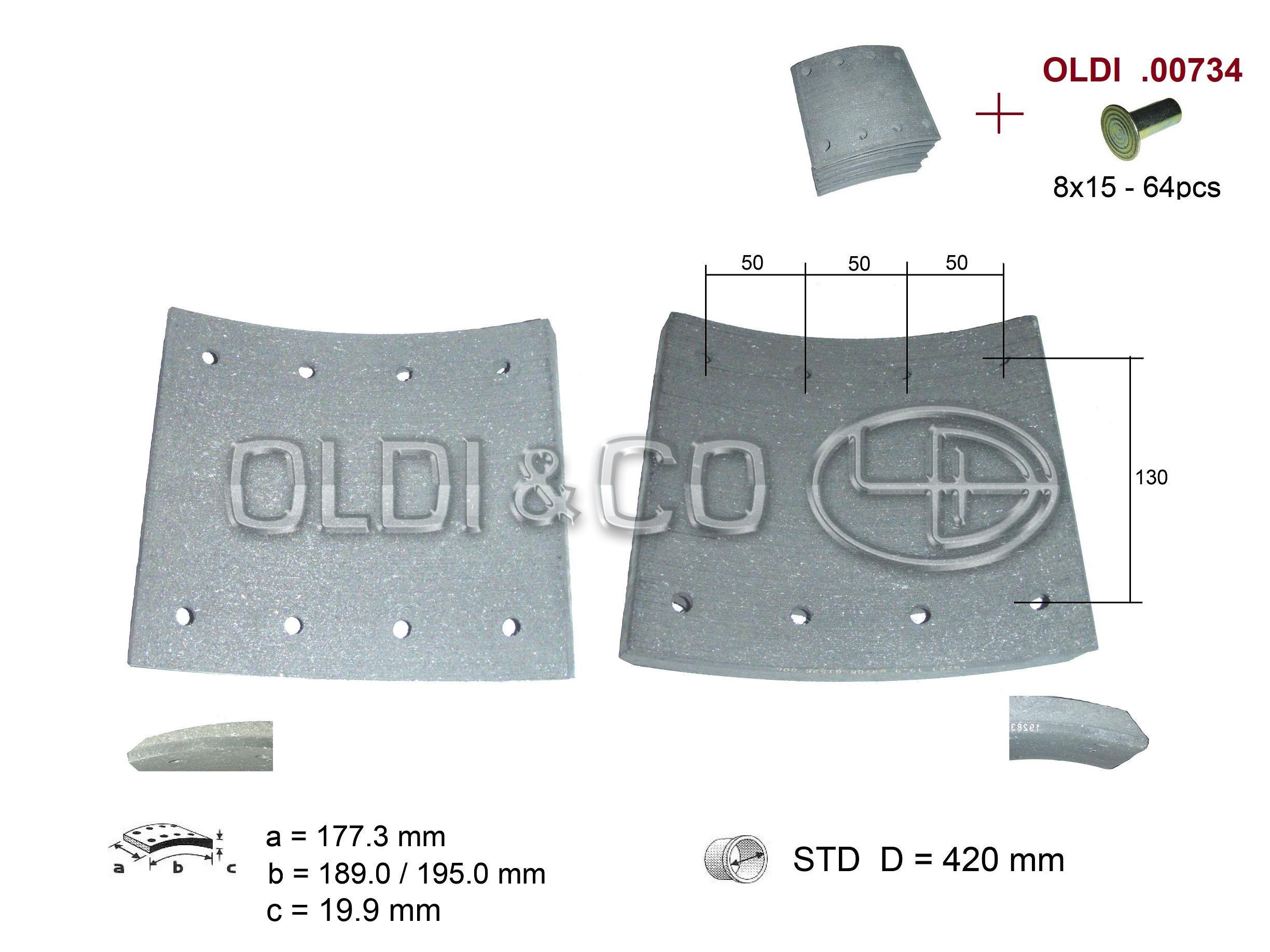 | Накладки, номер WVA: 19283 Ремонтный размер, мм: STD Тип заклепки: 8x15 Диаметр барабана, мм: 420 Длина, мм: 189/195 Количество заклёпок, шт: 64 Толщина, мм: 19.9/19.8 Ширина колодки, мм: 177.3 | ||||||||||||||||